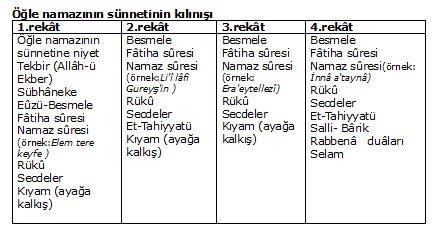 Öğle namazı için örnek namaz sûre sıralaması olarak yukarıda 1 - 2 - 3 - 4 ile numaralandırılmış ayetler yani Elem tere keyfe / Li'î lâfi Gureyş'in / Era'eytellezî / İnnâ a'taynâ sıralaması verilmiştir. (Burada örnek 10 sıralaması ile namaz kılınmıştır.)